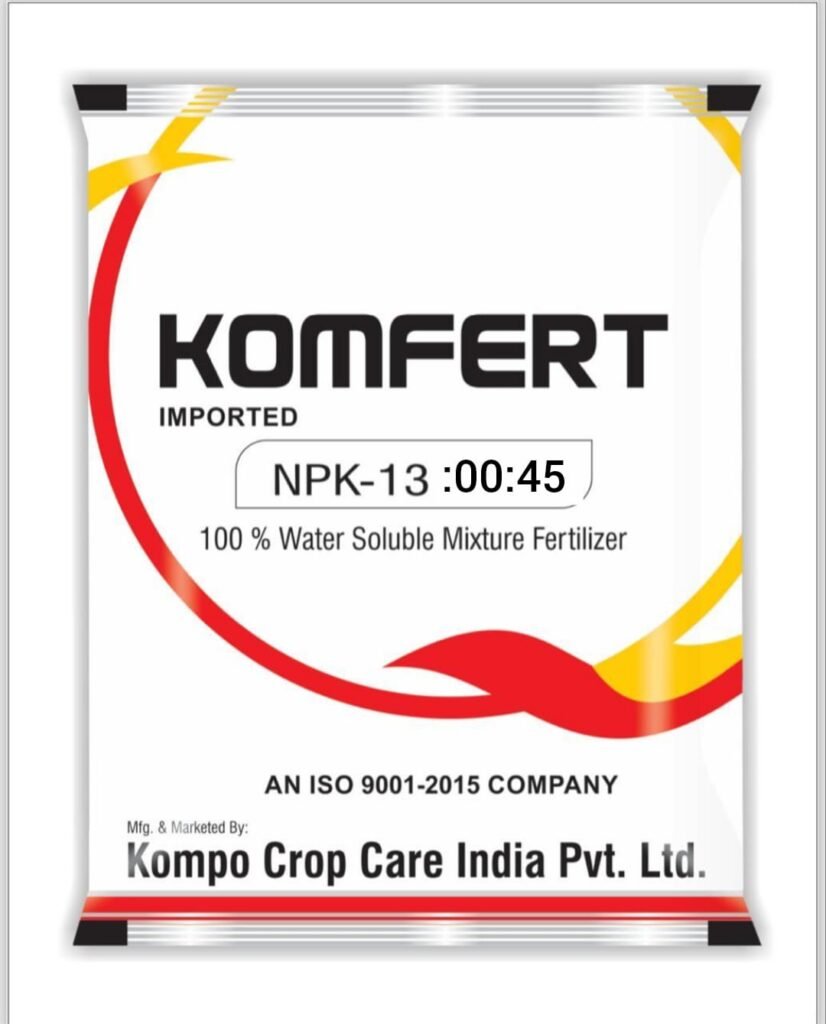 कोम्फर्ट ( 13 : 00: 45 ) यह एक विशेष आयातित 100% पानी में घुलनशील फर्टिलाइजर है जिसमे नाईट्रोजन 13% एवं पोटाश 45% उपलब्ध हैं। यह पौधो को आसानी से उपलब्ध हो जाता हैं। जिसे छिडकाव / ड्रिप सिचाई के माध्यम से दिया जा सकता हैं। इसके उपयोग से फुलो की संख्या में वृद्धि, फलो की वृद्धि, फलो में रस बनाने की क्षमता एवं इनका आकार व वजन बढ़ाने में किया जाता हैं। फसल का सर्वांगीण विकास होता है।
